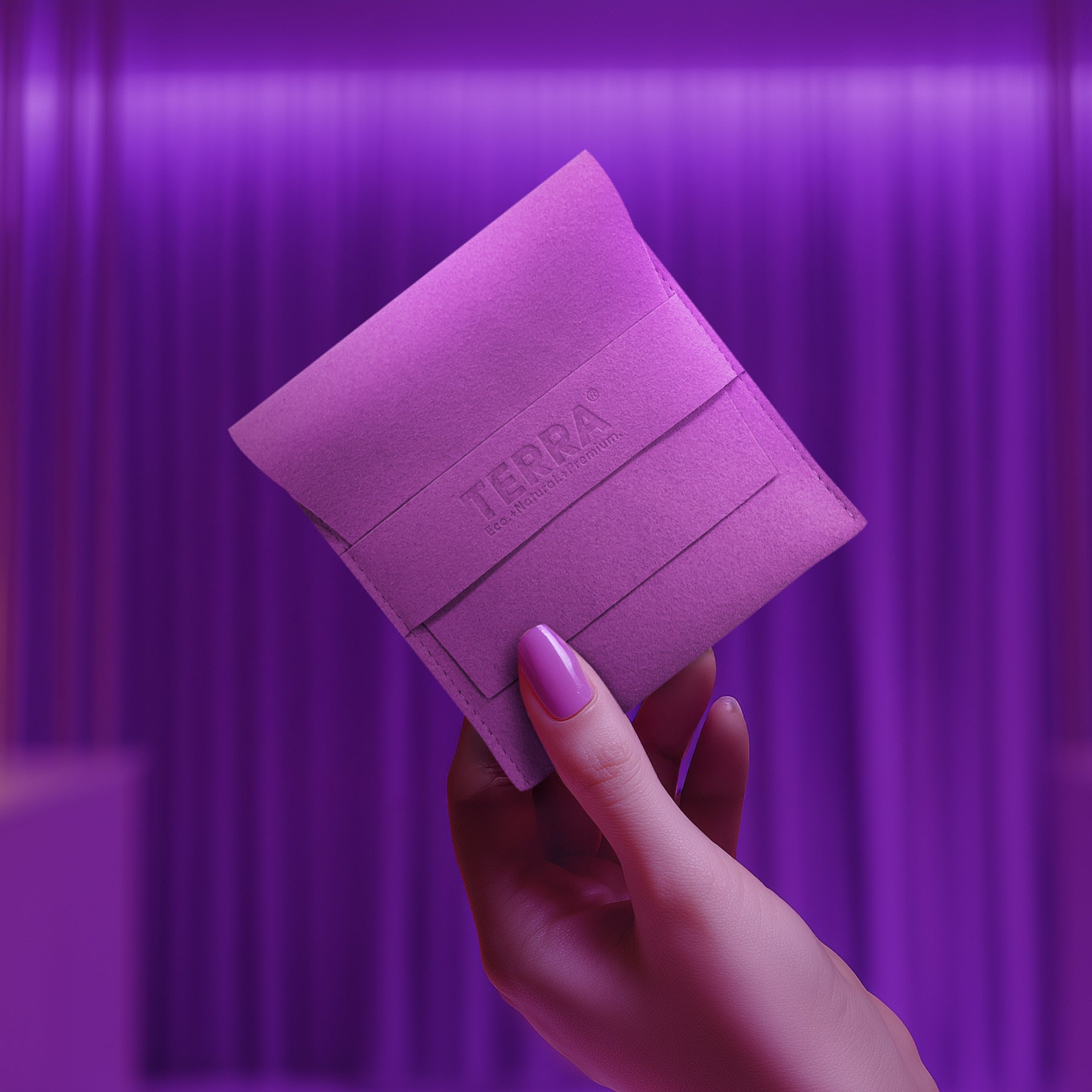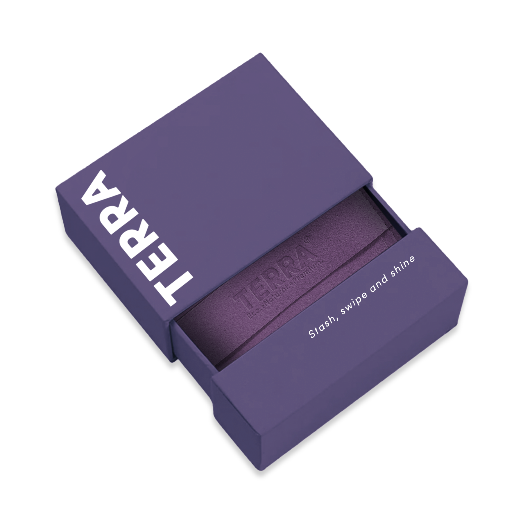 A sleek fold-over silhouette with an embossed TERRA logo, presented in premium packaging, making it a timeless accessory or the perfect gift.