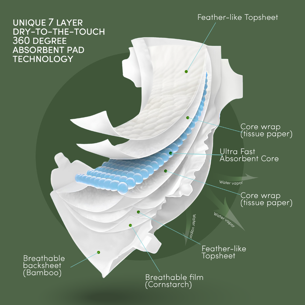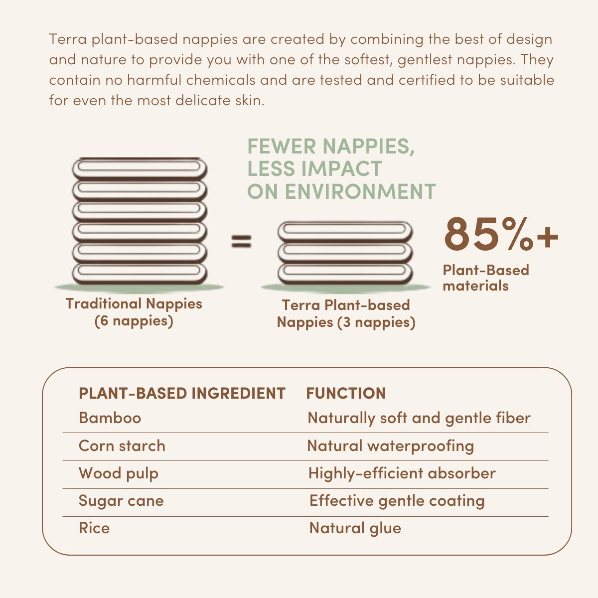 They are made with biodegradable bamboo fibre and a plant-based core. While not fully compostable due to hygiene regulations, they break down much faster than conventional nappies.