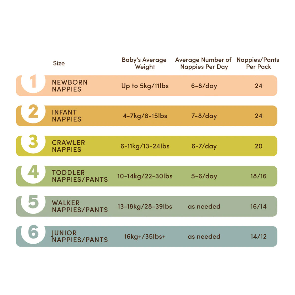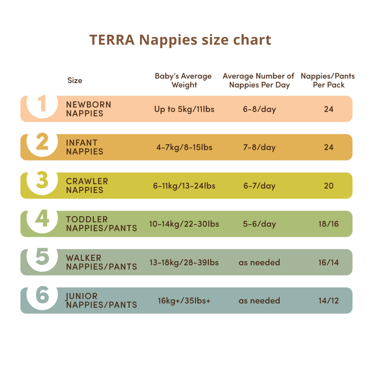 From Toddlers to Juniors, our easy size chart helps you choose the right Terra Nappy Pants for every stage. Gentle, comfy, and planet-friendly, because every baby deserves the perfect fit.